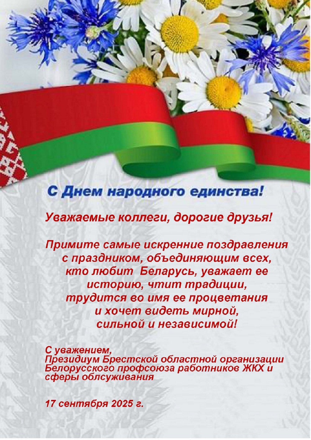 Поздравление Президиума Брестской областной организации Белорусского профсоюза работников ЖКХ и сферы обслуживания